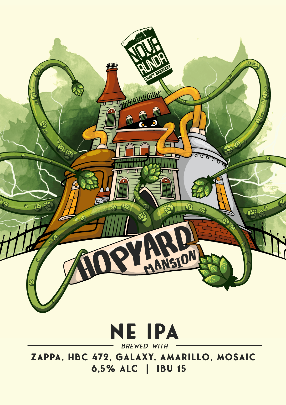 Dobrodošli u Hopyard Mansion - vilu u kojoj zahmeljeni duhovi vladaju svakim kutom! Ova NEIPA je kao da ste ušli u opsjednutu vilu gdje vas na svakom koraku čekaju Zappa, HBC 472, Amarillo i Galaxy hmeljevi koji su odlučili da se tu nastane zauvijek. Jednom kad uđete u Hopyard Mansion, možda se više nećete htjeti iseliti!