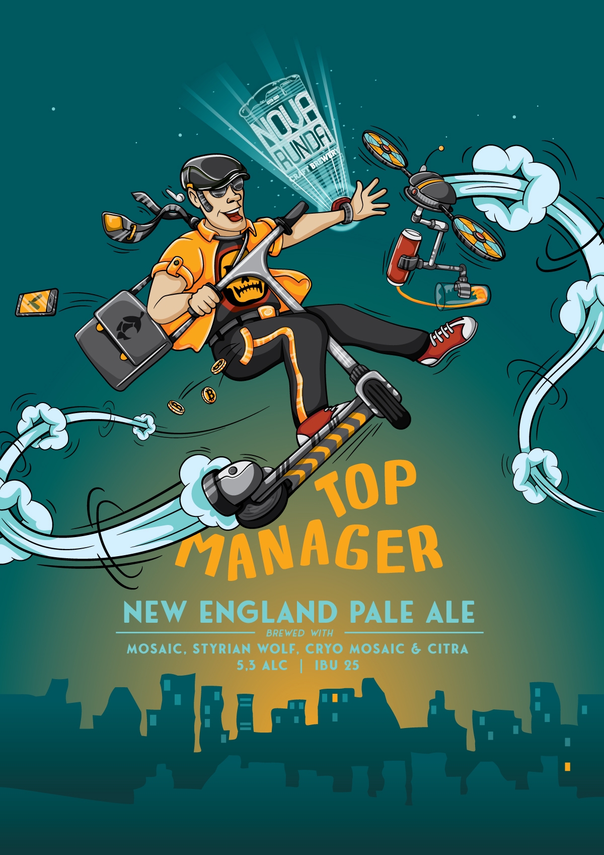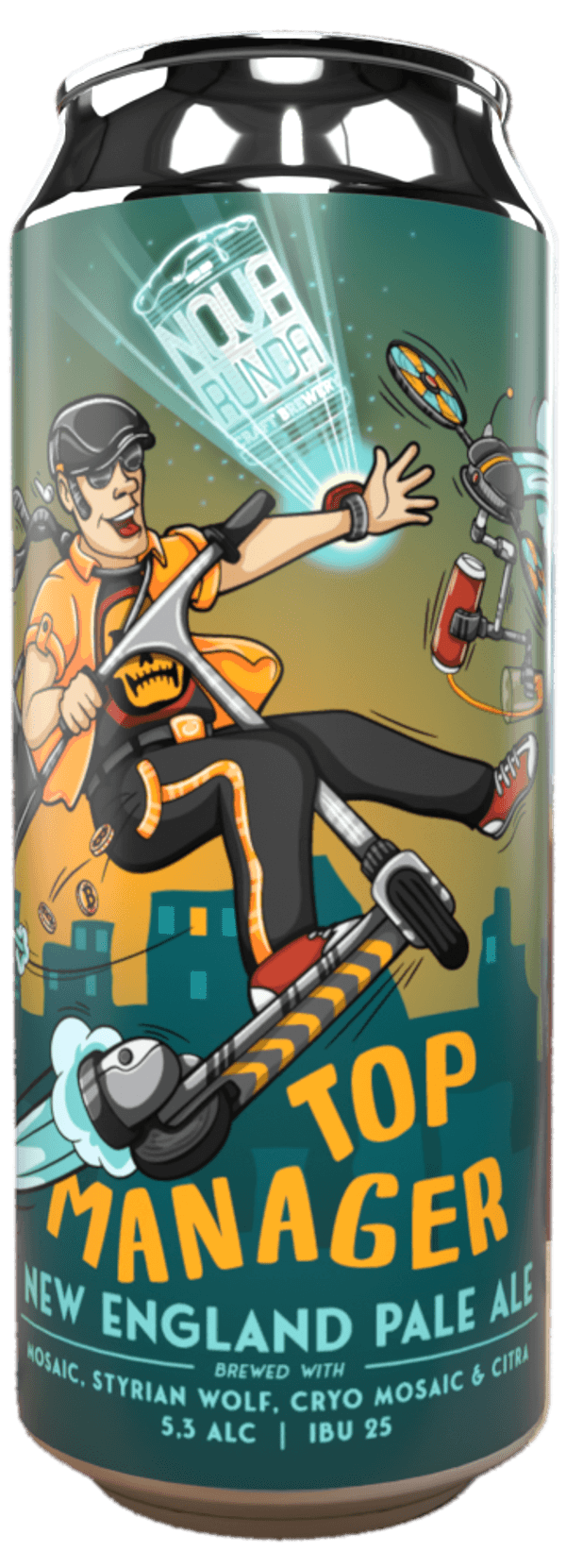 Stara garda Top Managera je vozila Mercedese, nosila brčine, pušila je po kancelarijama i mahala svojim kožnim aktovkama. Novi soj Menadžerije vozi romobile na posao i piju oat milk latte dok kupuju Bitcoin. Top Manager je stilski New England Pale Ale - moderna verzija klasičnog American Pale Alea. To znači da ima pitkost kao i dobre stare APA-e, ali manje gorčine i više hmeljne agresivnosti zahvaljujući hmeljnoj trojci - Mosaic, Citra i Styrian Wolf.